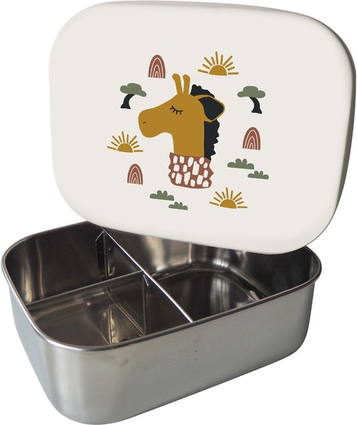 Die Kikadu Brotdose Giraffe macht die Pause ein Stück glücklicher. Auf dem Silikondeckel begrüßt eine lächelnde Giraffe kleine Pausenfans, während im Inneren drei Fächer darauf warten, Obst, Knabberzeug oder kleine Leckereien getrennt zu verstauen. Die leichte Edelstahlbox ist stabil, handlich und passt perfekt in Kita- und Schulrucksäcke.