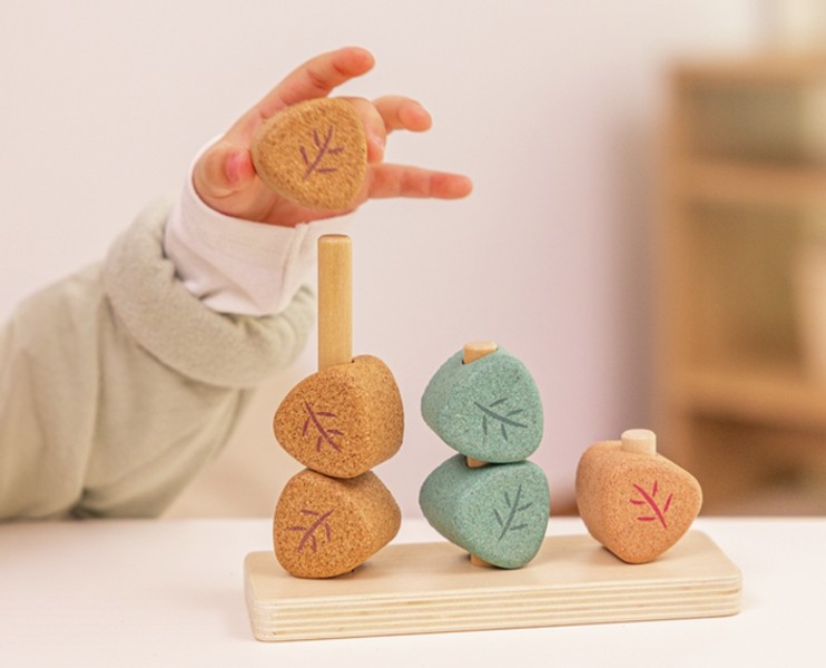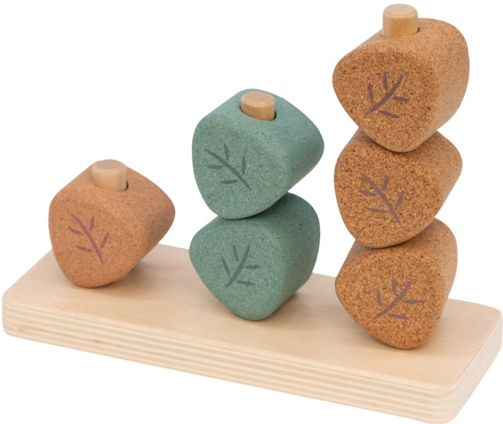 Die leicht beweglichen Stäbe machen das Stapeln zur kleinen Herausforderung. Jeder Turm verlangt Konzentration, jeder Korkstein eine Entscheidung. Eltern können das Spiel aktiv begleiten: Farben benennen, Mengen erfassen, Unterschiede erkennen. So entsteht ein gemeinsamer Lernmoment, der sich ganz natürlich ins Spiel integriert.