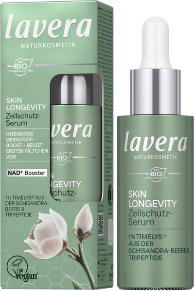 Das Lavera Skin Longevity Zellschutz-Serum mit NAD+ Booster, 1% TIMELYS® aus der Schisandra-Beere und Tripeptiden kann die Hautalterung auf Zellebene verlangsamt.