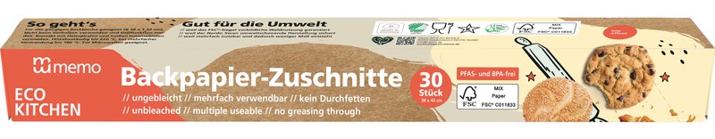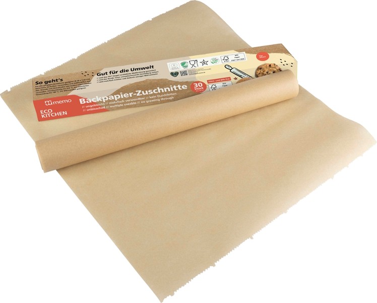 Die fettdichten memo Backpapier Zuschnitte sind für alle gängigen Backbleche geeignet. Sie sind beidseitig silikonbeschichtet, sodass es auch ohne Einfetten zu keinem Anhaften kommt. Zudem sind sie hitzebeständig bis 220 °C (bei Mehrfachnutzung bis 180 °C). Auch für die Mikrowelle geeignet.