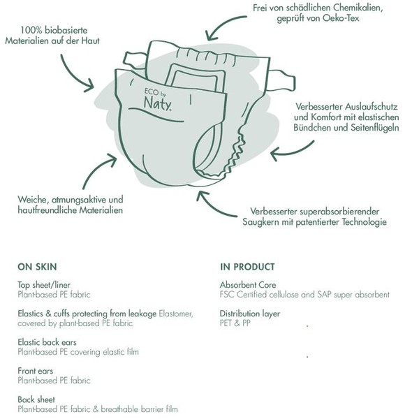 Die Naty Windeln überzeugen durch ihr angenehmes Tragegefühl dank ihrer weichen, atmungsaktiven und hautfreundlichen Materialien. In Kontakt mit der empfindlichen Kinderhaut kommen nur zu 100% pflanzenbasierte Materialien. Mit ihrem effektiven Saugkern aus Zellulose und patentierter Technologie, ihren elastischen Bündchen und Seitenflügeln bietet die Naty Windeln einen zuverlässigen Auslaufschutz und Komfort - bei Tag und Nacht.