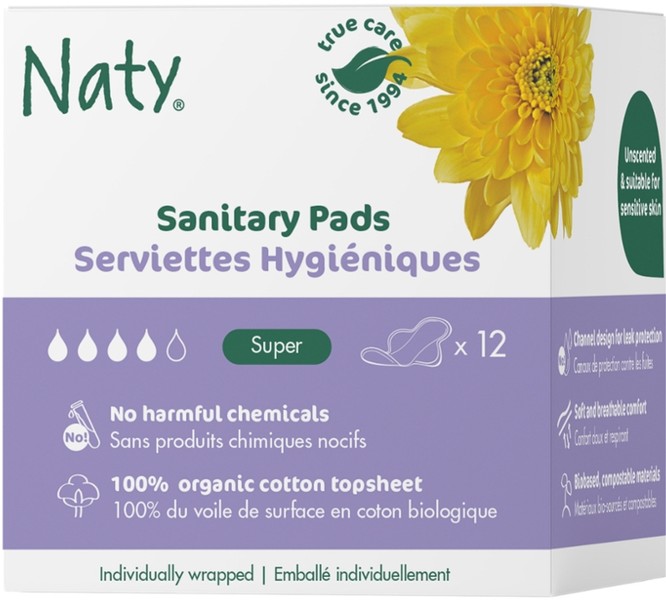 Naty Damenbinden Super bestehen aus 100% Bio Baumwolle in direktem Kontakt mit der Haut. Sie werden aus pflanzlichen und kompostierbaren Materialien hergestellt. Für Tage mit etwas stärkerer Menstruation, mit Flügeln.