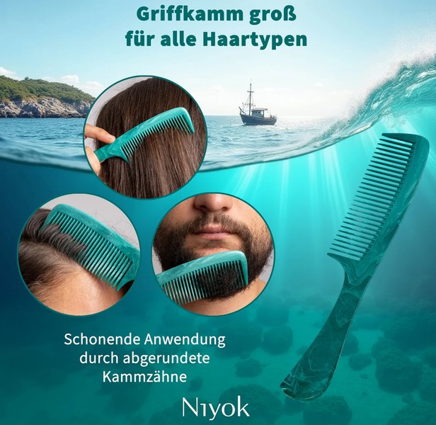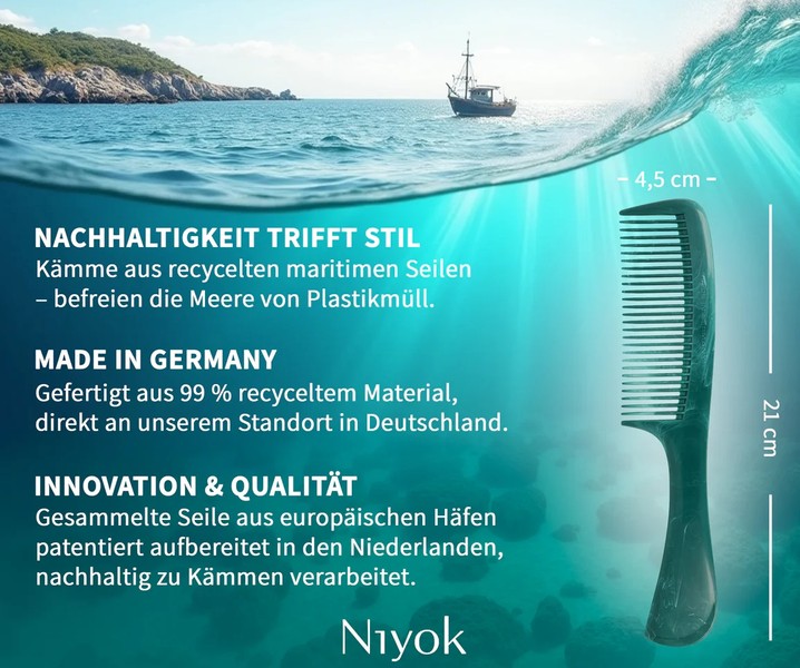 Niyok Griffkamm aus recycelten Tauen eignet sich hervorragend zum Kämmen und Stylen aller Haarlängen und Haartypen.