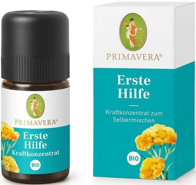 Primavera Erste Hilfer Kaftkonzentrat zur Mischung in Mandelöl bio oder punktuell ein Tropfen pur zur regenerierenden Hautpflege nach leichtern Prellungen und Stößen sowie bei Spannungsgefühlen der Haut aufgrund von Schwellungen oder blauen Flecken. Der Dreiklang aus den Bio Pflanzenkräften von Immortelle, Lavendel fein und Cistrose ist in der Aromatherapie als Mischung für die Haut bewährt.
