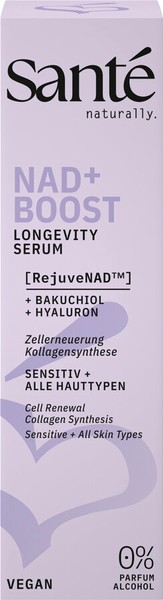 Das Sante NAD+ Boost Longevity Serum ist die innovative Pflegeformel für eine Haut, die sich erneuert, stärkt und jugendlich frisch wirkt. Mit dem Wirkstoffkomplex aus RejuveNAD™, Bakuchiol und Kalpariane unterstützt das Sante Serum die natürliche Zellerneuerung, steigert die Kollagensynthese und hilft, ersten Zeichen der Hautalterung vorzubeugen.