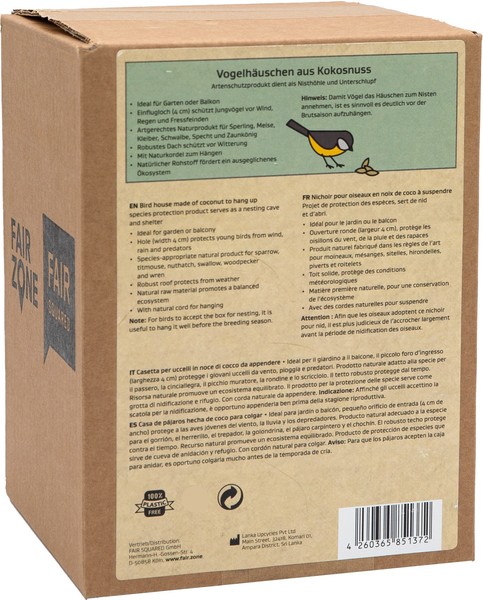 Das Vogelhaus dient als Futterstelle und wird in Handarbeit auf Sri Lanka hergestellt. Es besteht aus einer einzigen, ganzen Kokosnuss. Die Schale der Nuss ist so geschnitzt, dass sie als Dach fungiert. Die Aufhängung wird aus einem Seil aus Kokosfasern angefertigt. So ist das Vogelhäuschen zu 100 % natürlich und fügt sich optisch gut im Garten ein.