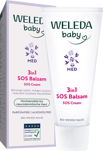 Der intensiv pflegende Weleda Med Baby SOS Balsam kann die Haut nach der 1. Anwendung beruhigen. Ideal für die tägliche Pflege trockener Hautstellen. Auch für hochsensible Erwachsenenhaut geeignet.