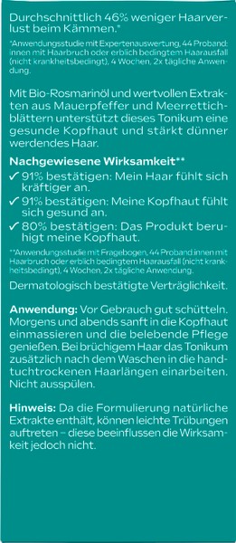Vor Gebrauch gut schütteln. Morgens und abends sanft in die Kopfhaut einmassieren und die belebende Pflege genießen. Bei brüchigem Haar das Weleda Haartonikum zusätzlich nach dem Waschen in die handtuchtrockenen Haarlängen einarbeiten. Nicht ausspülen.